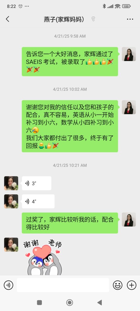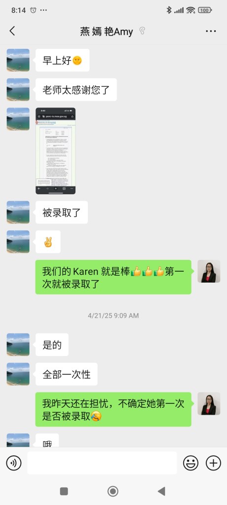 另外,在中国攻读硕士期间,我曾在大专院校兼职任教,也曾在新加坡Success Master补习中心任教。 通过多年的辅导经验,我非常熟悉我所教科目的新加坡教学大纲。 我辅导过的很多学生在AEIS/S-AEIS考试中都取得了不错的成绩。 有些学生在一次尝试中就通过了AEIS,而另一些则通过 两次尝试成功了。为了尽快追上本地学生,我的一些学生通过AEIS/S-AEIS考试后仍继续跟我学习了一段时间。